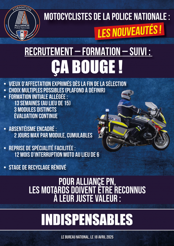 MOTOCYCLISTES DE LA POLICE NATIONALE : LES NOUVEAUTES ! Publication : 18 avril 2025 Lire la suite... Bureau National